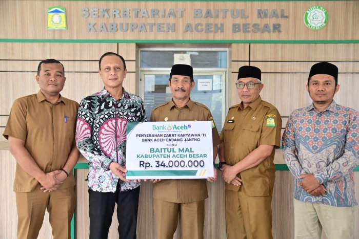 Wakil Bupati Aceh Besar Drs H Syukri didampingi Asisten Pemerintahan dan Kesejahteraan Rakyat Sekdakab Aceh Besar Farhan AP, serta Kepala Sekratariat Baitul Mal Aceh Besar, Apriadi ST menerima zakat karyawan dan karyawati PT. Bank Aceh Syariah Cabang Jantho yang diserahkan oleh pimpinan PT. Bank Aceh Syariah Cabang Jantho, Mursal di sekretariat Baitul Mal Kabupaten Aceh Besar, Senin (9/3/2026).
