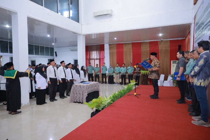 Bupati Aceh Besar H Muharram Idris melantik 6 orang Kepala Sekolah dan menyerahkan SK perpanjangan PPPK tahun 2025 formasi guru jenjang SD dan SMP sebanyak 356 orang serta penyerahan SK Pelaksana Tugas Jenjang TK dan PAUD Negeri sebanyak 14 orang di Aula Dekranasda Aceh Besar, Kamis (13/3/2025).