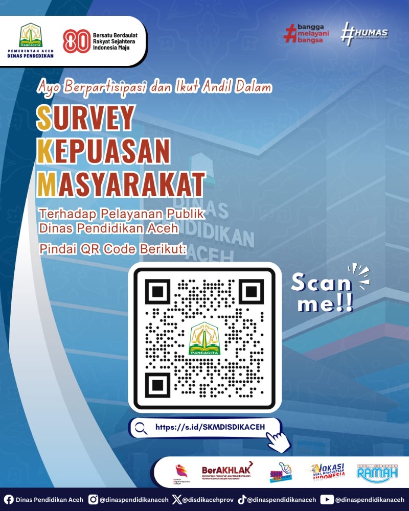 Marthunis juga mendorong partisipasi luas masyarakat. Survei tersebut dapat diakses dengan mudah melalui kanal resmi media sosial Dinas Pendidikan Aceh, baik di Instagram maupun Facebook. Selain itu, masyarakat juga dapat langsung mengisi survei melalui tautan berikut: https://s.id/SKMDISDIKACEH.