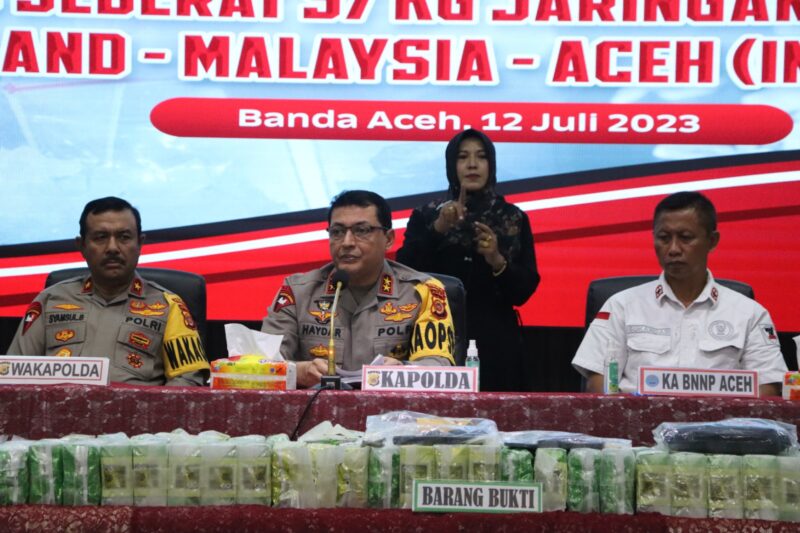 Personel Gabungan Timsus Ditresnarkoba Polda Aceh bekerja sama dengan Dirtipid Narkoba Mabes Polri, dan Kanwil Bea Cukai Aceh membongkar kasus narkotika jenis sabu jaringan internasional: Thailand—Malaysia—Aceh (Indonesia), Selasa, 4 Juli 2023