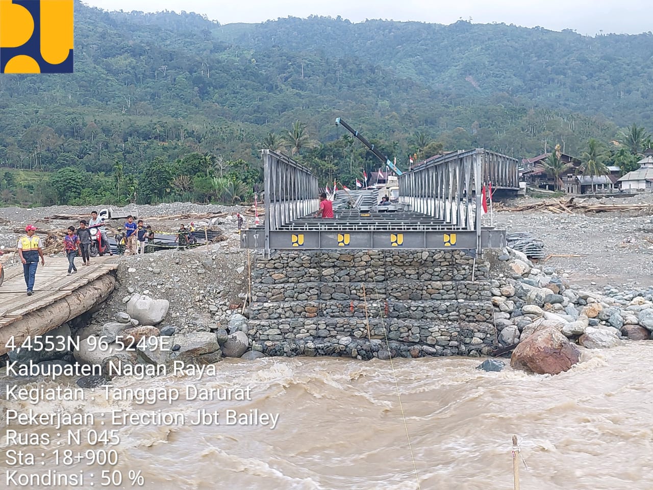 Hingga awal Januari 2026, pembangunan Jembatan Bailey (jembatan rangka baja darurat) di Beutong Ateuh Benggala di Kabupaten Nagan Raya mengalami kemajuan signifikan, yang terdampak bencana banjir bandang dan longsor pada akhir tahun 2025. Berdasarkan informasi terbaru dari Pejabat Pembuat Komitmen (PPK) 2.7 Provinsi Aceh Abdul Chalid, ST.,MT, hingga 2 Januari 2026, progres perakitan jembatan Bailey di Beutong Ateuh Banggalang, Nagan Raya, memang sudah memasuki tahap akhir. Angka 80% selaras dengan laporan pemantauan lapangan pada akhir Desember 2025 hingga awal Januari ini.
