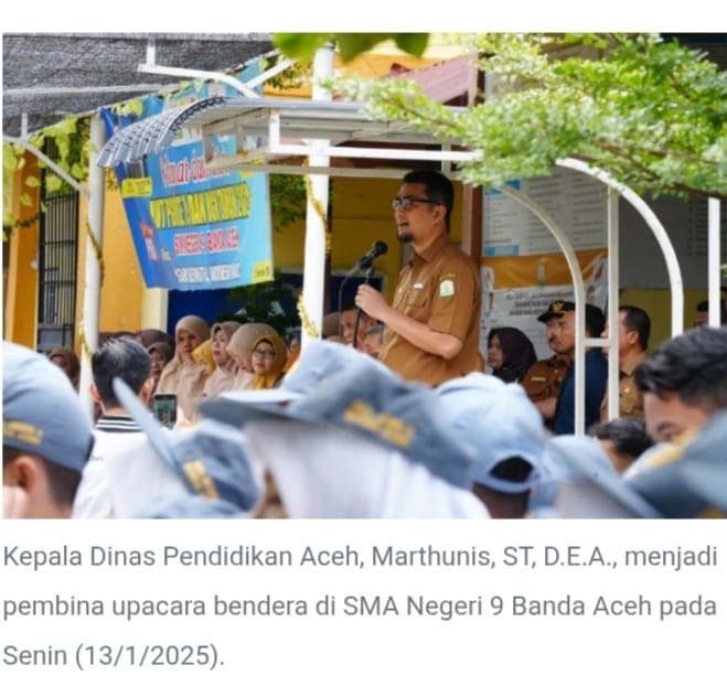Kepala Dinas Pendidikan Aceh, Marthunis, ST, D.E.A., menjadi pembina upacara bendera di SMA Negeri 9 Banda Aceh pada Senin (13/1/2025). Dalam amanatnya, beliau memberikan motivasi serta arahan kepada para siswa-siswi dan dewan guru yang hadir pada upacara tersebut.