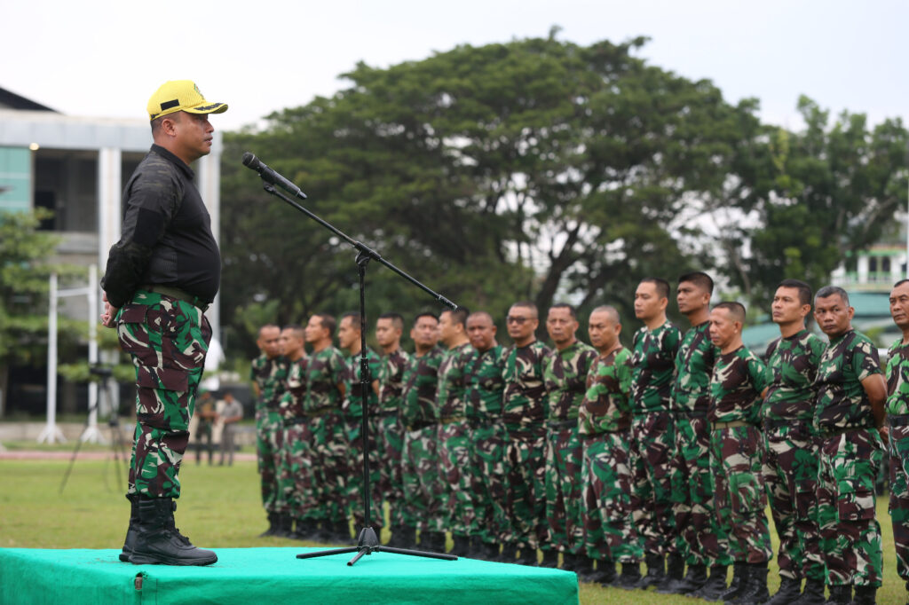 Kajasdam IM, Kolonel Inf Andy Bagus Diyan Arika mewakili Pangdam IM memimpin apel dan Sosialisasi beladiri taktis di lapangan Jasdam IM, Banda Aceh, Kamis (02/05/24).