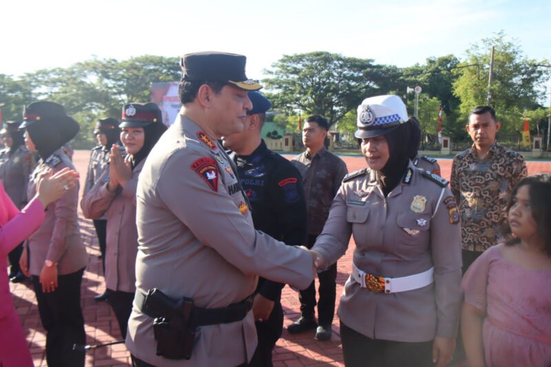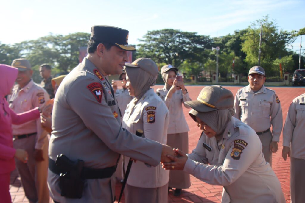 Setelah upacara korp raport, Kapolda Aceh beserta para pejabat utama mengucapkan selamat kepada personel Polri dan ASN yang naik pangkat dengan menyalaminya satu persatu. (***)