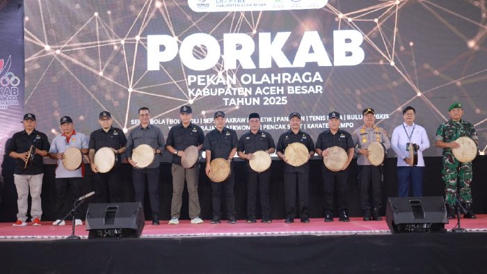 Bupati Aceh Besar H. Muharram Idris (Syech Muharram) secara resmi membuka Pekan Olahraga Kabupaten (PORKAB) Aceh Besar Tahun 2025 dengan memukul rapai bersama Forkopimda Aceh Besar, di Jantho Sport City (JSC), Kota Jantho, Senin (9/9/2025). Ajang yang untuk pertama kalinya digelar di Aceh Besar ini diharapkan menjadi wadah penting dalam menjaring bibit unggul calon atlet masa depan.