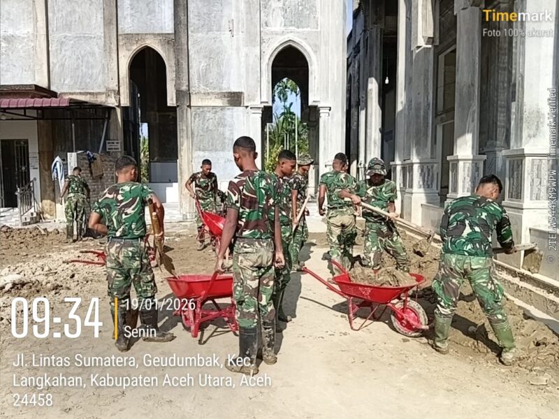 Personel Batalyon Zeni Tempur (Yonzipur) 5/Arati Bhaya Wighina bersama personel Koramil 29/Langkahan, Kodim 0103/Aceh Utara, melaksanakan kegiatan pembersihan Masjid Raudlatul Huda di Desa Bantayan, Kecamatan Langkahan, Kabupaten Aceh Utara, pasca bencana alam banjir bandang dan tanah longsor yang melanda sebagian wilayah Provinsi Aceh, termasuk Aceh Utara. Kegiatan ini dilaksanakan pada Senin (19/1/2026) dan telah mencapai progres 100 persen.