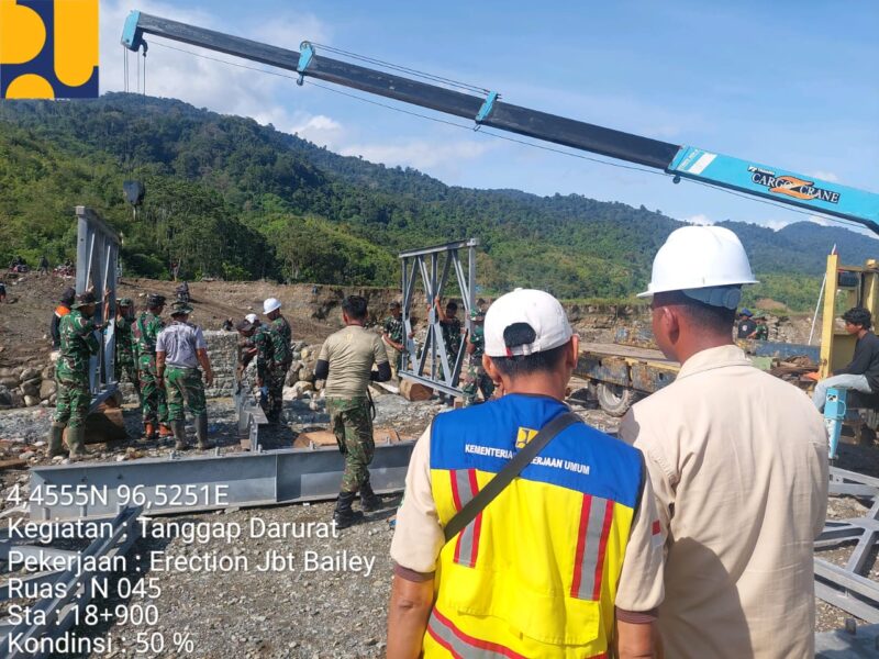 Selain itu, Kementerian PU juga melakukan pemasangan Jembatan Bailey dengan bentang 30 meter, hingga saat ini progres pemasangan terus dikebut dan ditargetkan rampung pada 30 Desember 2025.