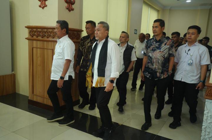 Sekretaris Daerah (Sekda) Aceh, M. Nasir, menyambut kedatangan Menteri Koordinator Bidang Pangan RI Zulkifli Hasan bersama Menteri Perdagangan RI Budi Santoso dan Menteri Kelautan dan Perikanan RI Sakti Wahyu Trenggono di Bandara Internasional Sultan Iskandar Muda (SIM), Aceh Besar, Kamis (8/1/2026).