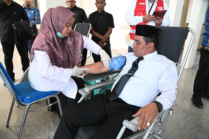 Bupati Aceh Besar Syech Muharram Idris mendonorkan darah pada Aksi Bakti Sosial dalam rangka Peringatan Hari Jadi Kota Jantho Ke-41 tahun sekaligus Hari Pendidikan Nasional tahun 2025 di Kantor Bupati Aceh Besar, Kota Jantho, Senin (05/05/2025). Selain Bupati Aceh Besar, para pejabat dan ASN dalam lingkup Pemkab Aceh Besar juga melakukan donor darah yang berlangsung sehari tersebut sebagai bentuk partisipasi sosial kemanusiaan.