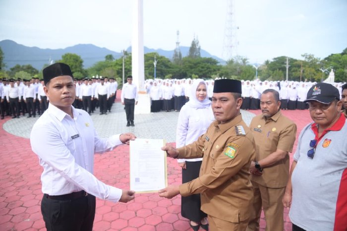Bupati Aceh Besar Muharram Idris menyerahkan Surat Keputusan (SK) pengangkatan 890 Pegawai Pemerintah dengan Perjanjian Kerja (PPPK) tahap I di lingkungan Pemkab Aceh Besar. Penandatanganan dan Penyerahan SK Pengangkatan tersebut dilakukan secara simbolis oleh Bupati Aceh Besar kepada perwakilan PPPK di halaman Kantor Bupati Aceh Besar, Kota Jantho, Senin (08/09/2025).