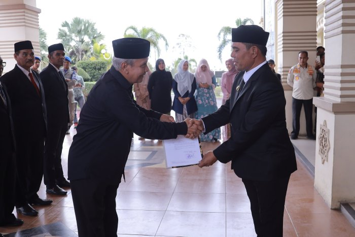 Penyerahan SK Plt Dirut PDAM Tirta Mountala dilakukan bersamaan dengan pelantikan sejumlah pejabat eselon lainnya di lingkungan Sekretariat Daerah Kabupaten (Setdakab) Aceh Besar.
