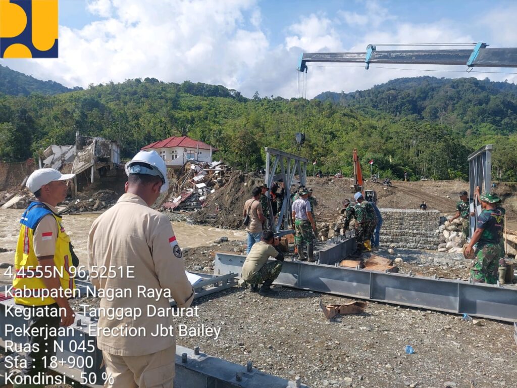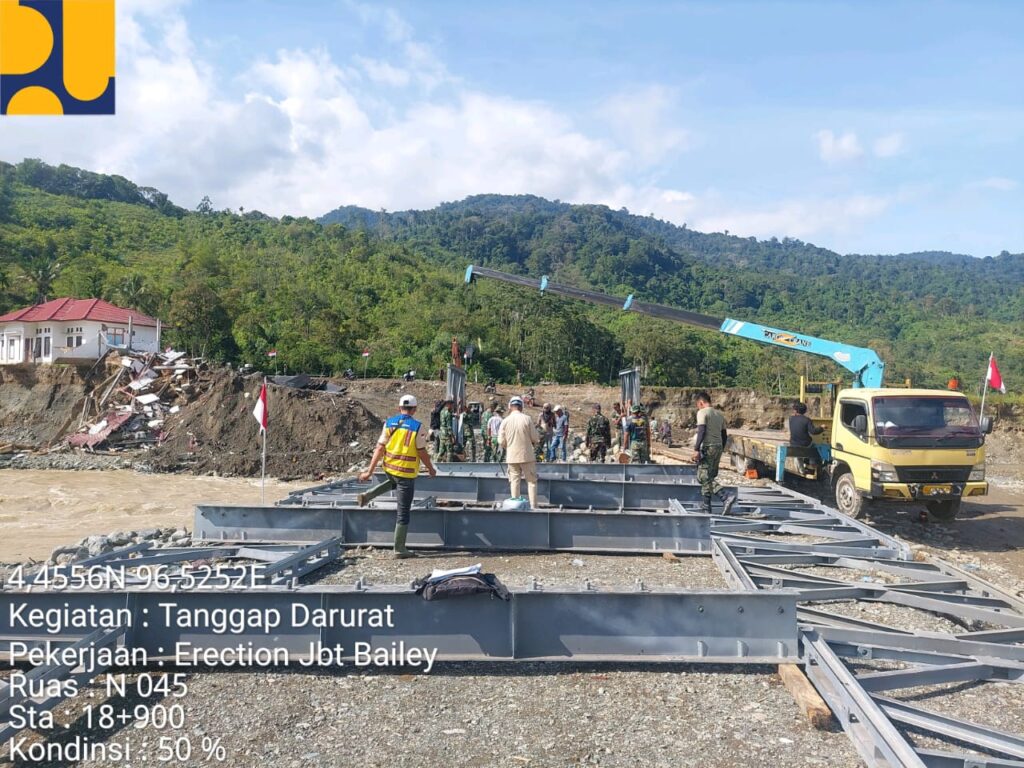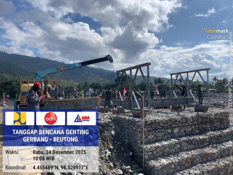 Untuk memastikan seluruh akses jalur darat di Provinsi Aceh dapat kembali terhubung, prajurit TNI di lapangan Bersama Tim Teknis dari Satker PJNW II Provinsi Aceh telah bekerja secara maksimal dengan mengebut pembangunan Jembatan Bailey di lokasi terdampak bencana. Pada tahap ini, fokus pekerjaan diarahkan pada pemasangan panel jembatan, gelagar lintang, penguatan struktur, serta pemasangan topang silang guna menjamin kekuatan dan keamanan jembatan sebelum digunakan oleh masyarakat.