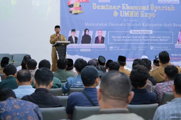 Wakil Bupati Aceh Besar Drs. H. Syukuri A. Jalil membuka Seminar Ekonomi Syariah dan UMKM Expo yang digagas oleh Masyarakat Ekonomi Syariah (MES) Aceh Besar di Gedung Lembaga Administrasi Negara (LAN), Gampong Lamcot, Kecamatan Darul Imarah, Senin (20/10/2025).